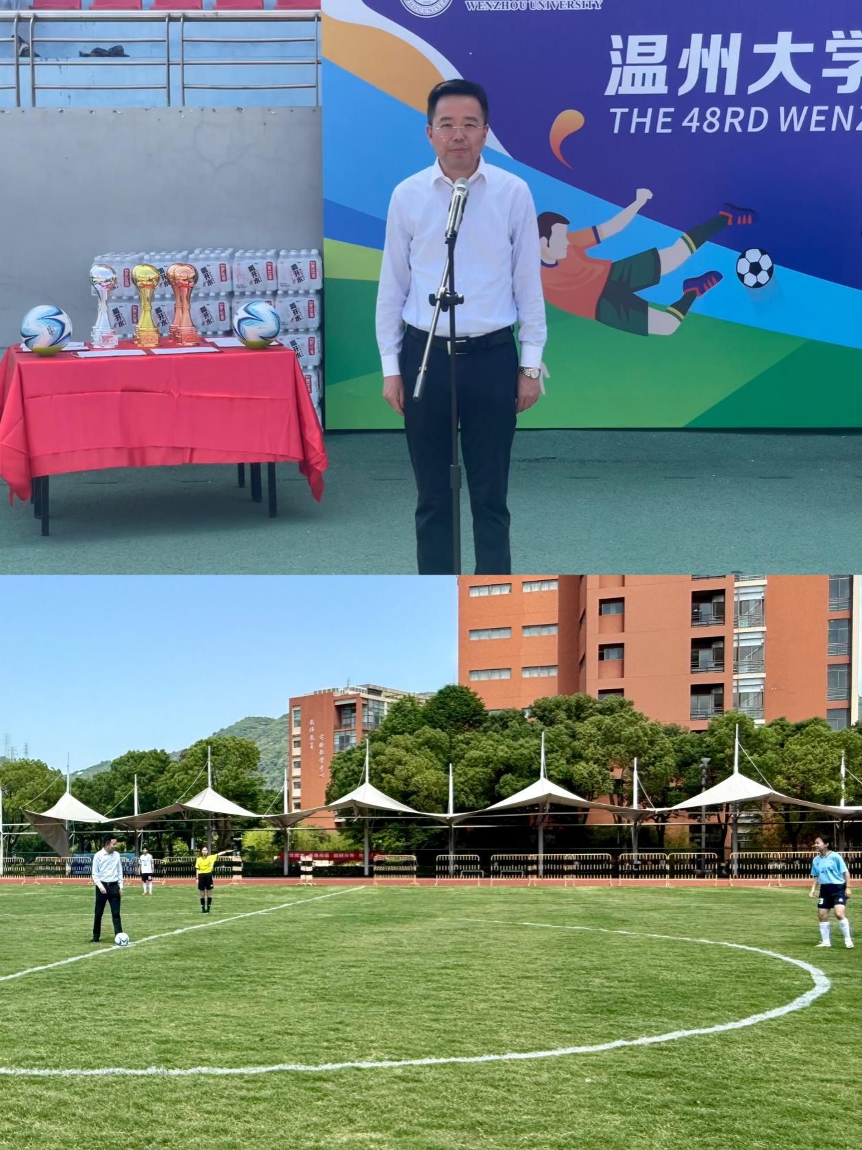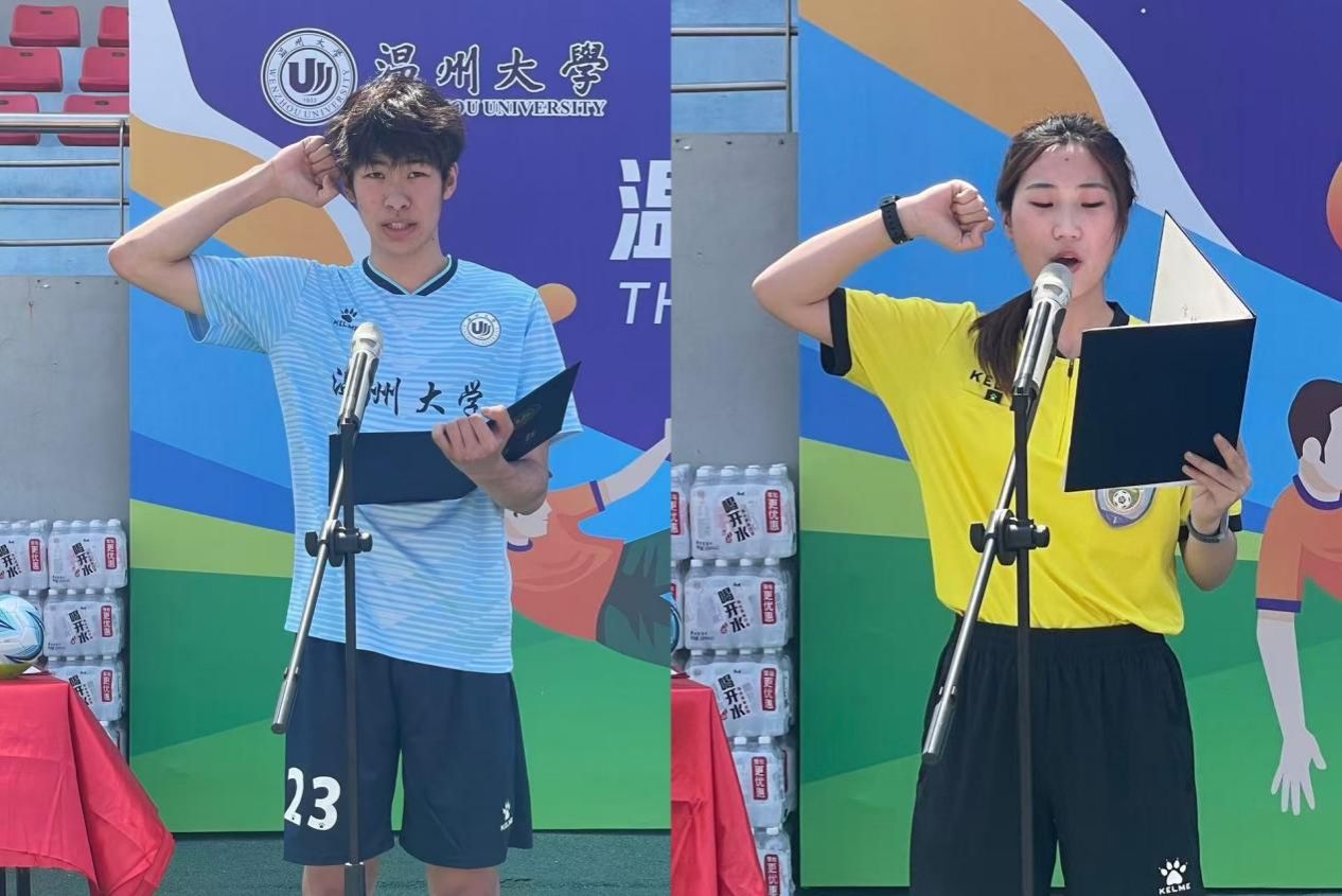 温大体育与健康学院党委书记周德奎代表大赛组委会致辞。他指出,beat365官方网站不断深化“五育融合”,高度重视体育工作,近年来学校足球运动发展成果显著。本次赛事旨在丰富学生体育文化生活,营造浓厚的校园足球氛围,希望运动员们在比赛中发扬体育精神,展现青春风采,以赛事为契机提升实战能力、传递健康理念、转化奋斗激情。