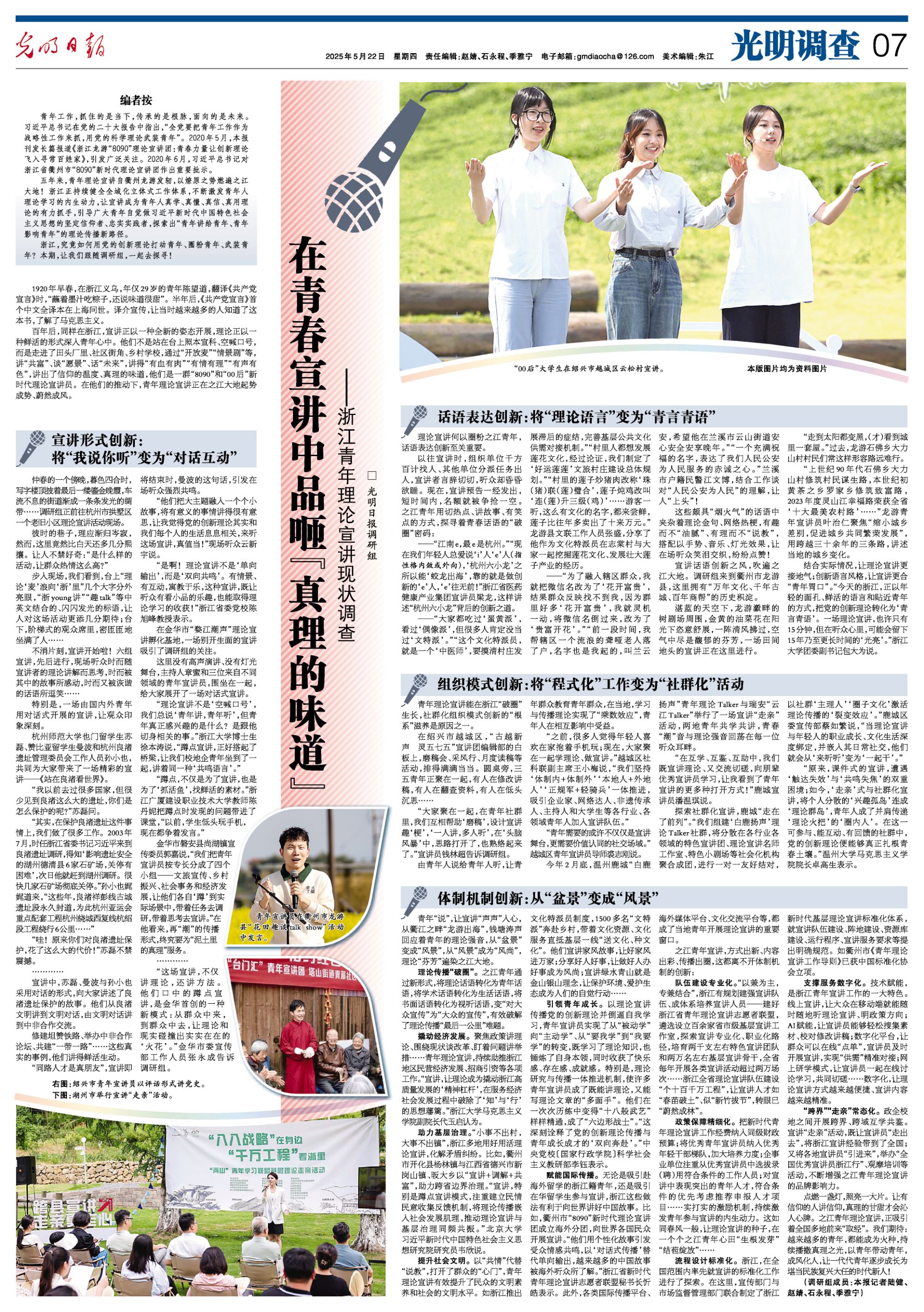百年后,同样在浙江,宣讲正以一种全新的姿态开展,理论正以一种鲜活的形式深入青年心中。他们不是站在台上照本宣科、空喊口号,而是走进了田头厂里、社区街角、乡村学校,通过“开放麦”“情景剧”等,讲“共富”、谈“愿景”、话“未来”,讲得“有血有肉”“有情有理”“有声有色”,讲出了信仰的温度、真理的味道,他们是一群“8090”和“00后”新时代理论宣讲员。在他们的推动下,青年理论宣讲正在之江大地起势成势、蔚然成风。