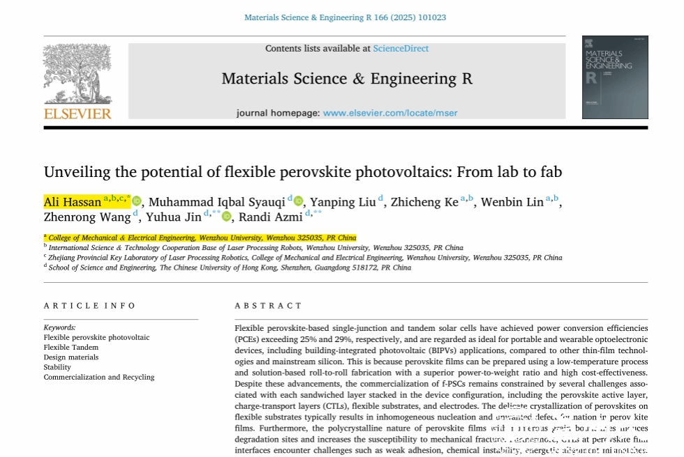 近日,beat365官方网站机电工程学院外籍教师Ali Hassan博士作为第一作者兼通讯作者,在国际著名综述期刊《Materials Science & Engineering R: Reports》发表了题为《Unveiling the potential of flexible perovskite photovoltaics: From lab to fab》的长篇综述论文。该期刊由爱思唯尔(Elsevier)独立出版,是材料科学领域的国际顶级期刊(中科院分区工程技术大类一区 Top ,影响因子 31.6)。