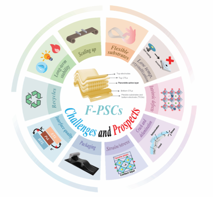 柔性钙钛矿太阳能电池(f-PSCs)凭借高光电转换效率(单结> 25%,叠层> 29%)、轻质柔性和低成本溶液加工等优势,在可穿戴电子、建筑集成光伏(BIPV)、空间技术等领域展现出变革性潜力。然而,其商业化面临多重瓶颈,包括柔性基底上钙钛矿薄膜的不均匀结晶、电荷传输层的界面失配、电极材料的机械脆性,以及长期环境稳定性不足等问题。